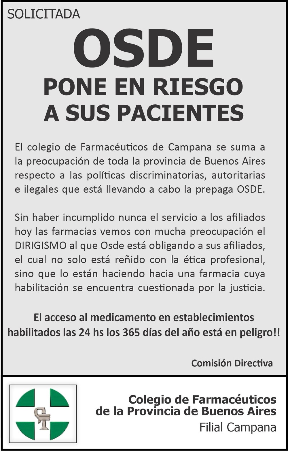 El Colegio de Farmacéuticos de Campana emitió un comunicado