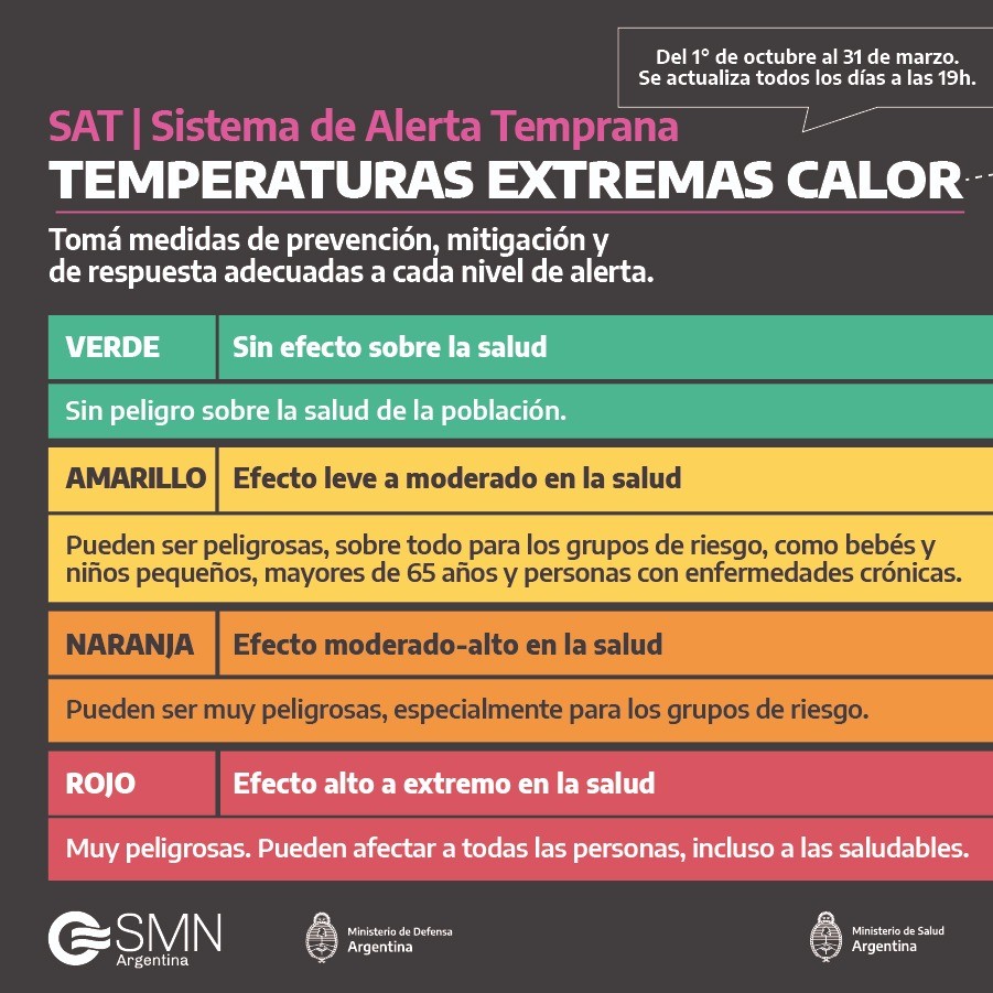 A partir de este octubre estará disponible el Sistema de Alerta Temprana por Temperaturas Extremas. Este producto unifica y reemplaza al SAT-OCS (Sistema de Alerta Temprana por Olas de Calor y Salud) que existía hasta ahora y a las advertencias por altas y bajas temperaturas. Una de las principales mejoras que tiene el nuevo producto es la ampliación territorial de alertas. Anteriormente, solo se emitía para 57 localidades. Con el SAT-Temperaturas Extremas, los alertas se emitirán para todo el territorio nacional y cuentan con niveles de colores: verde, amarillo, naranja y rojo, que advierten a la población sobre la necesidad de tomar ciertos recaudos debido al posible incremento de los efectos en la salud por la persistencia de temperaturas elevadas.