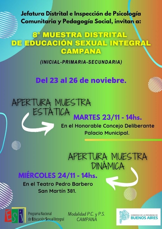 En el marco de la Ley 26150 desde hace 8 años la Modalidad de Psicología Comunitaria y Pedagogía Social de la Ciudad de Campana organiza la Muestra Distrital de Educación Sexual Integral. “La ESI a través de las artes” donde se exponen las diferentes producciones en torno a la temática trabajada en las instituciones educativas de nuestra ciudad.