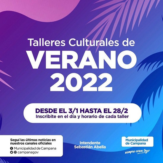 La Secretaría de Desarrollo Social, Educación y Cultura –a través de la Dirección de Cultura- informa a la comunidad que desde el 3 de enero hasta el 28 de febrero habrá talleres tanto en los barrios como en el centro de la ciudad.