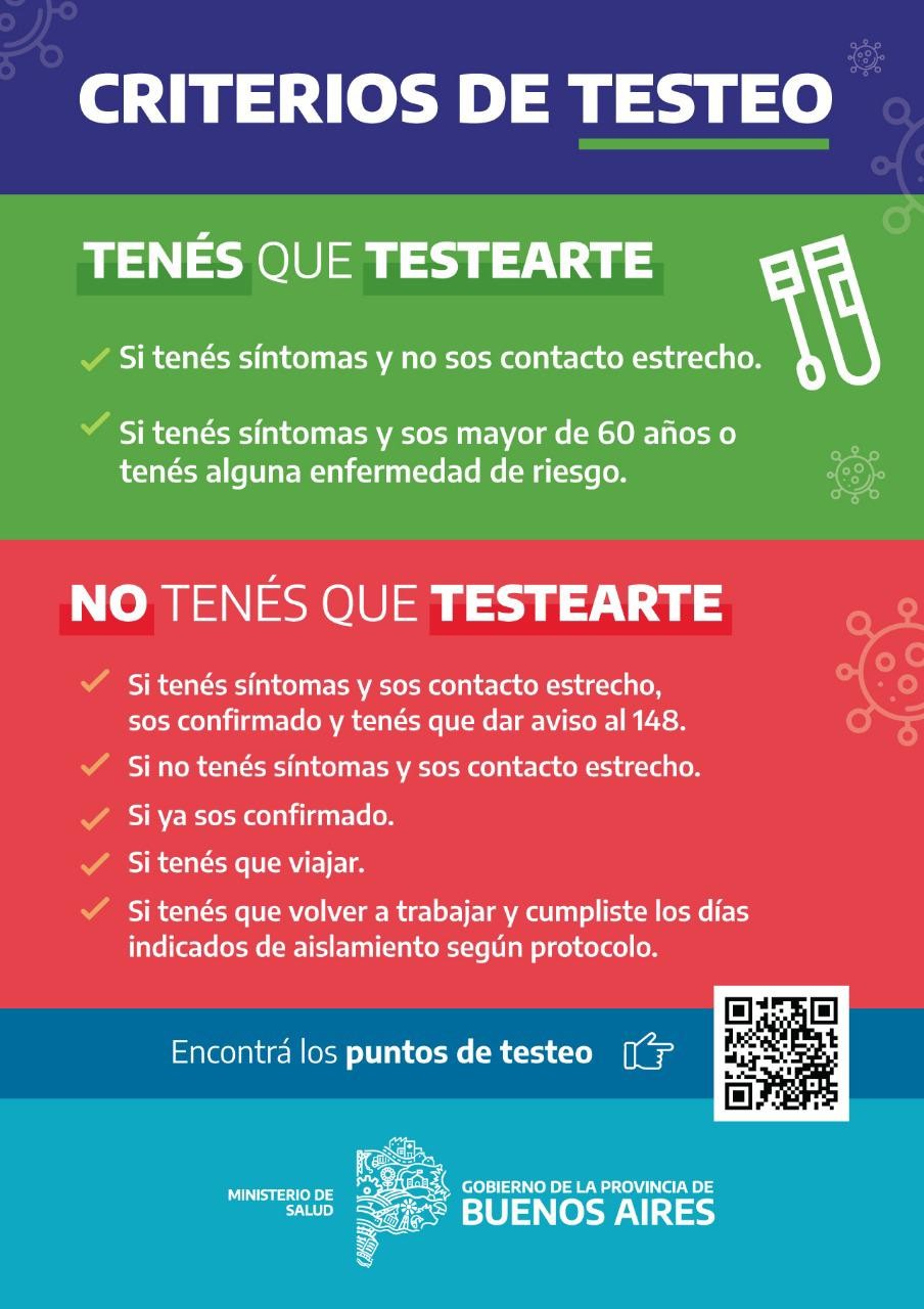 Sugieren consultar en el portal de puntos de testeo provincial antes de ir y chequear los nuevos criterios adoptados para testearse.