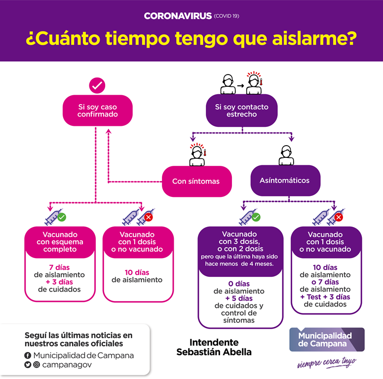 - Con esquema de vacunación completo: 7 días de aislamiento + 3 días de cuidados (no concurrir a eventos masivos o sociales, usar barbijo, mantener la distancia social y evitar contacto con personas con factores de riesgo).