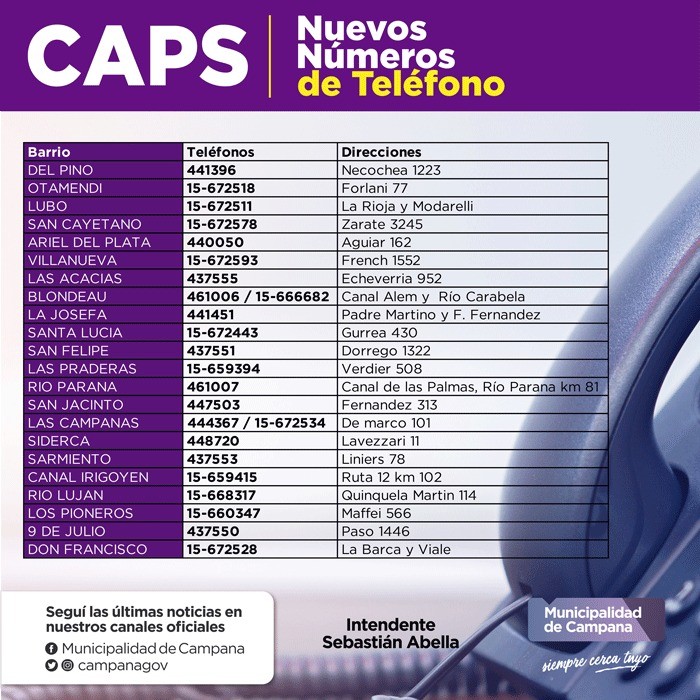 La Secretaría de Salud del Municipio informa que los números telefónicos de los Centros de Atención Primaria de la Salud (CAPS) y Centros Integradores Integrales (CIC) sufrieron algunas modificaciones.