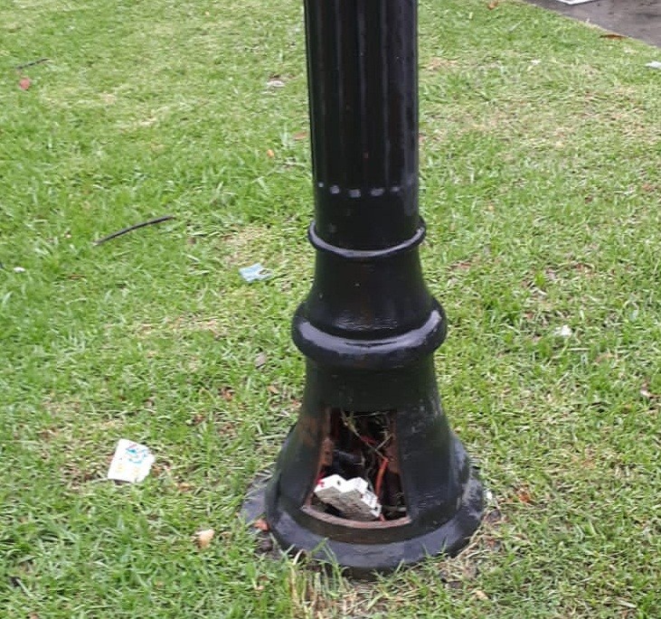 En las últimas horas se constató que fueron vandalizadas las columnas del alumbrado público de la plaza Eduardo Costa y desde el Municipio llaman a la población a tomar conciencia de la importancia de cuidar y respetar el mobiliario urbano.