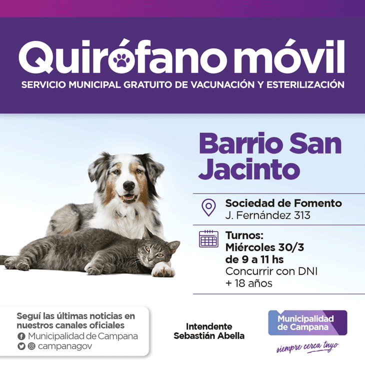 La Dirección General de Políticas y Desarrollo Sostenible del Municipio informa que el quirófano móvil estará la semana próxima en el barrio San Jacinto.