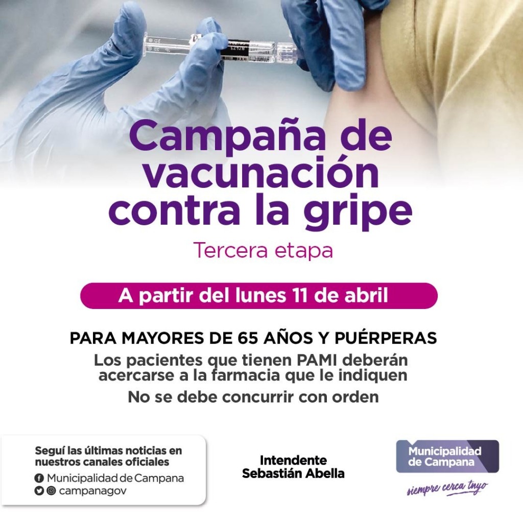 Luego de la aplicación de la vacuna antigripal al personal de salud, embarazadas, bebés de seis meses a 2 años y niños de 2 a 3 años que tengan factores de riesgo, desde el lunes comenzará la tercera etapa que contempla a las mujeres puérperas y los adultos mayores de 65 años.