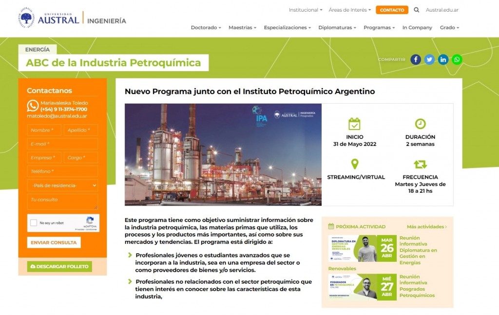 Para más información, se puede ingresar en https://www.austral.edu.ar/ingenieria-posgrados/programas/abc-de-la-industria-petroquimica/ .
