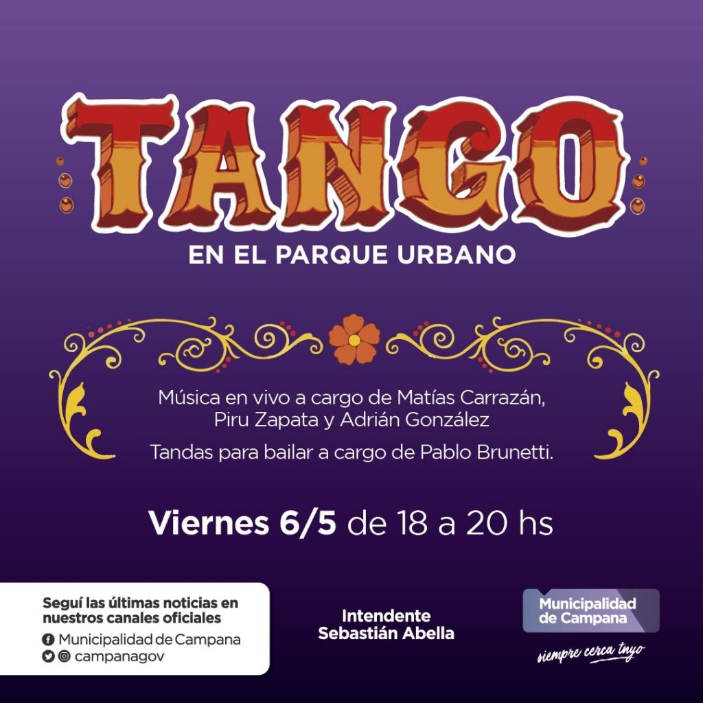 En el marco de la agenda cultural “Campana celebra el mes de la Patria”, hoy de 18 a 20 horas se llevará adelante un gran evento de tango en el Parque Urbano.