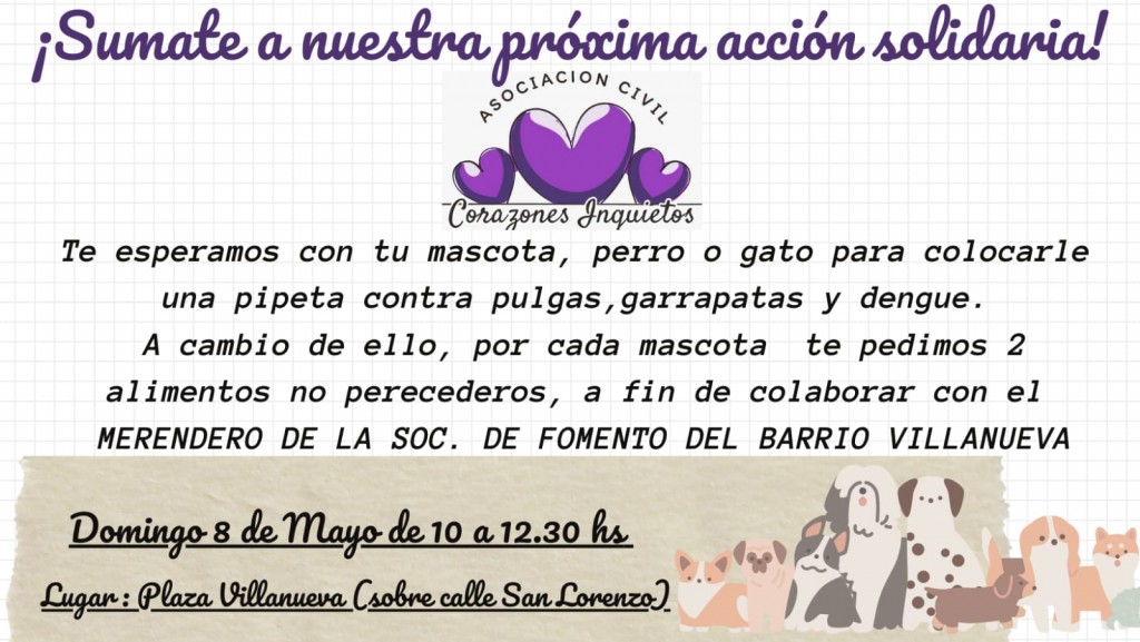 “Todos las vecinas y los vecinos de Campana que se quieran sumar pueden hacerlo trayendo 2 alimentos no perecederos, a cambio se le colocará una pipeta a su mascota” explicaron desde “Corazones Inquietos” y agregaron que “todo lo recaudado será donado al merendero de la Sociedad de Fomento del barrio Villanueva”.