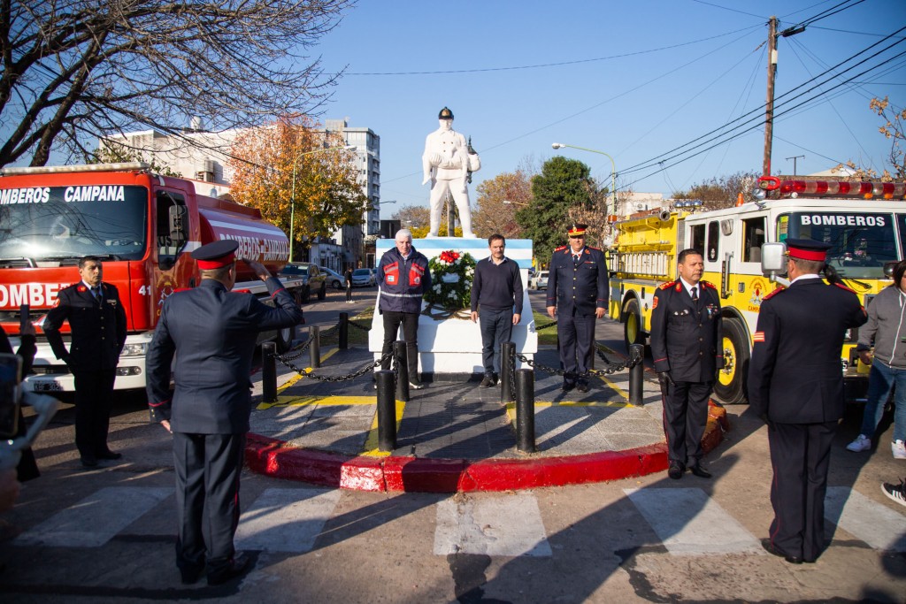Una vez finalizado el acto conmemorativo, el jefe comunal saludó a los efectivos y agradeció a todos los bomberos que “con una inmensa valentía arriesgan su vida y cuidan a todos los campanenses día a día. Hoy más que nunca tenemos que reconocer a estos héroes que salen con vocación a cumplir la profesión con entrega y pasión”.