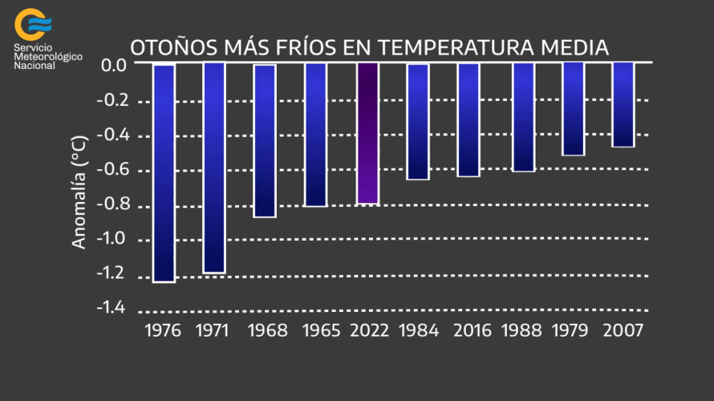 - No se registraba un otoño tan frío desde 1976 en Argentina, con una anomalía de temperatura de -0,8°C. Le siguen por detrás los otoños de 1965 y 1968.