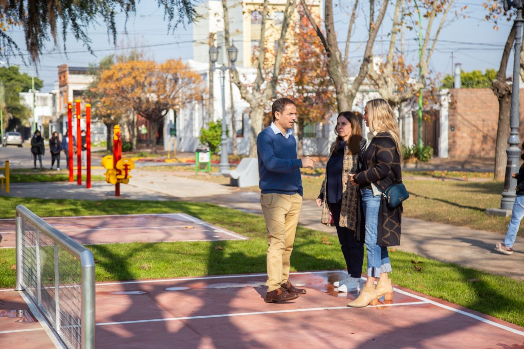 Las postas aeróbicas fueron reubicadas a un costado de la vereda perimetral de la plaza para favorecer su utilización. También se construyeron dos canchas de fútbol-tenis. El intendente Abella recorrió el lugar y anunció que se planificarán nuevas mejoras.