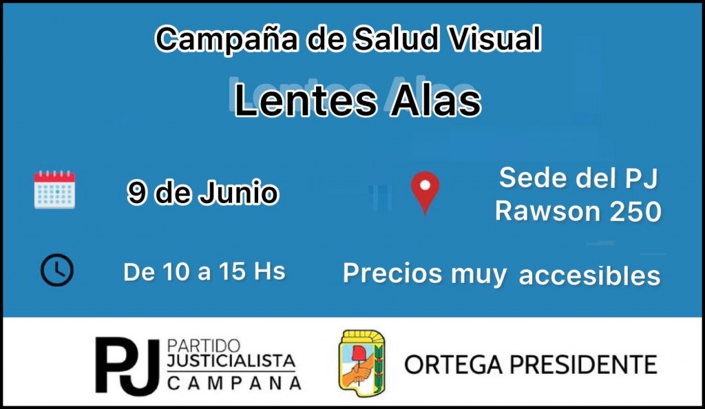 El Partido Justicialista de Campana, que preside Carlos Ortega, lanzará este jueves la campaña de Salud Visual “Lentes Alas” cuyo objetivo es posibilitar el acceso a lentes graduados a todos los vecinos de Campana que lo necesiten, a precios muy accesibles.