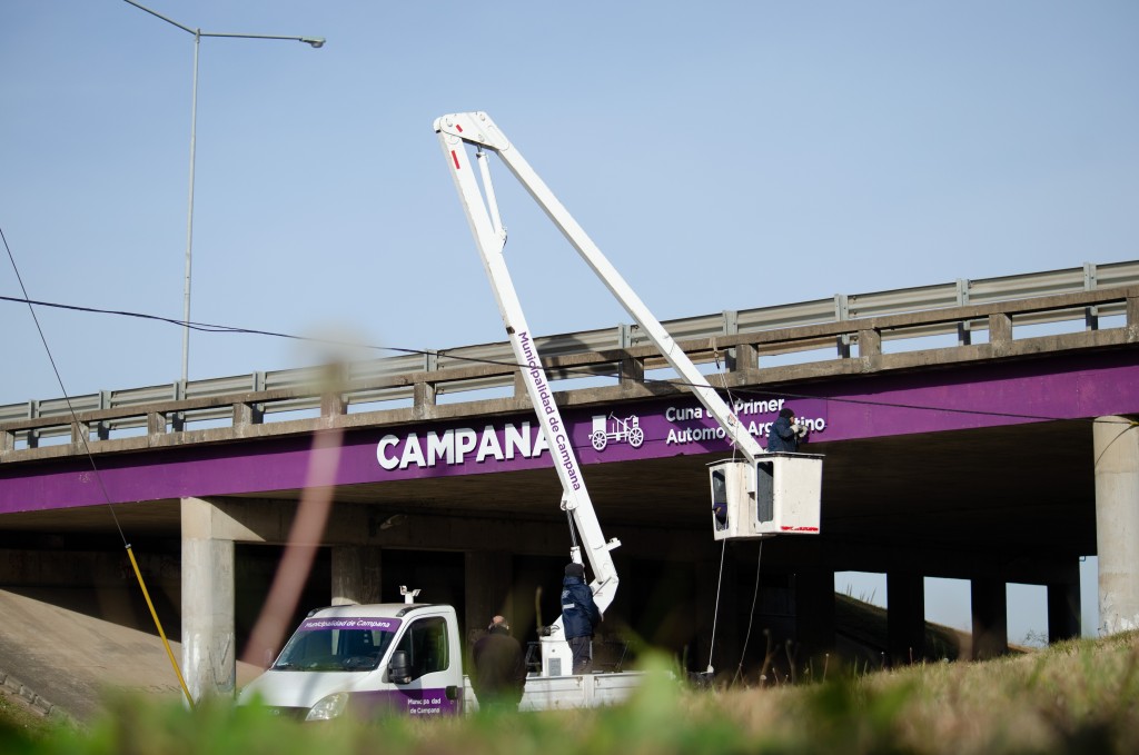 Allí, como ya se había realizado en el paso de la avenida 6 de Julio por la autopista, se pintó y se colocó un cartel que identifica el acceso, cuya leyenda es: “Campana, Cuna del Primer Automóvil Argentino”.