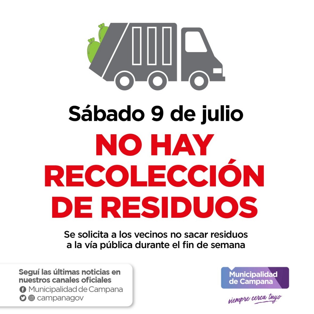 La Subdirección de Higiene Urbana, dependiente de la Secretaría de Planeamiento, Obras e Ingeniería Urbana del Municipio, informa que este sábado 9 de julio no habrá recolección de residuos.