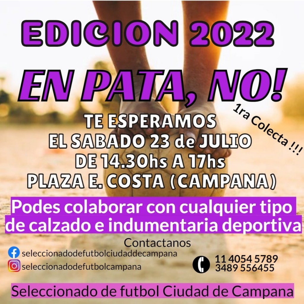 El Seleccionado de Fútbol Ciudad de Campana, coordinado por Facundo Arona y Fernando Saravia, tuvieron una exitosa edición en el 2021, con gran cantidad de calzado y ropa, que conjuntamente con Zoe Puentes de TODOS PUEDEN JUGAR, activaron este actividad social, que tuvo muy buena repercusión. Para esta edición 2022 los Organizadores renuevan la invitación a todos lo que que quiera colaborar con este desafió, invitándolos a la 1era colecta el dia Sabado 23 de 14,30 horas a 17 horas en la Plaza E. Costa. Podrán colaborar con cualquier tipo de calzado y ropa deportiva.