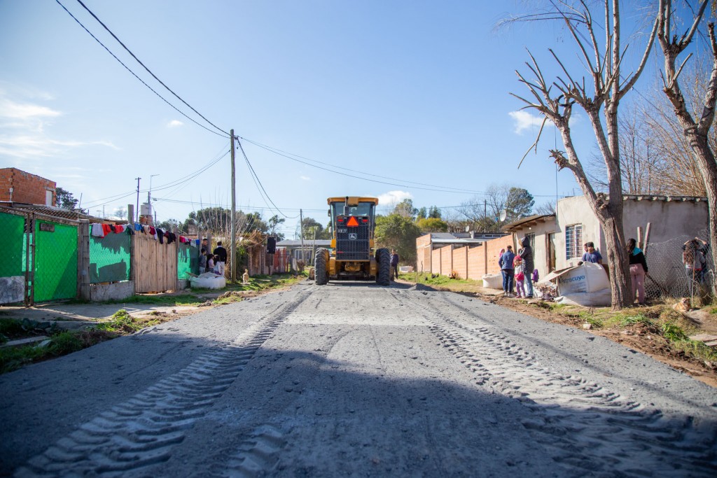 Una cuadrilla de la Secretaría de Espacio Público del Municipio completa con este material las arterias que quedaban de tierra. Esta semana, el intendente Abella supervisó el avance de los trabajos.