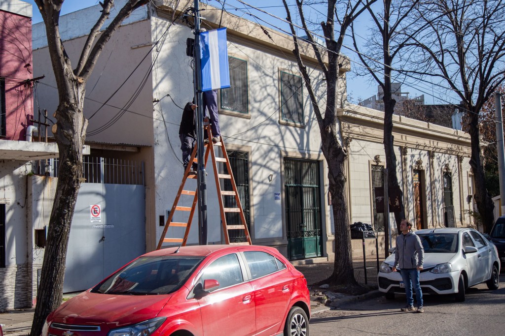 En las últimas horas, una cuadrilla municipal montó un operativo para embanderar la arteria desde la plaza Eduardo Costa hasta Ameghino y el intendente Sebastián Abella recorrió el lugar para constatar las tareas.