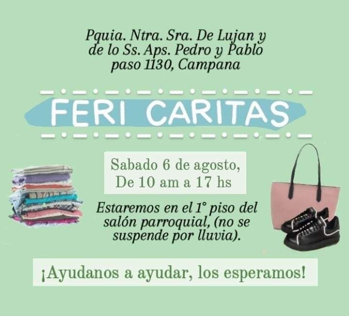 Se realizará el sábado 6 de agosto de 10 a 17 horas en la planta alta de la Parroquia Nuestra Señora de Luján y de los Santos Apóstoles Pedro y Pablo donde se realiza la venta de ropa usada en muy buen estado a precios accesibles y con el dinero recaudado se adquieren alimentos que se distribuyen a familias necesitadas mensualmente.