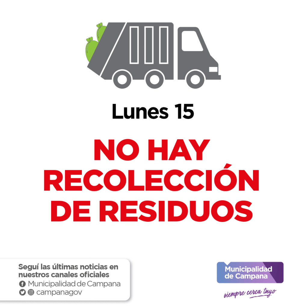 La Subdirección de Higiene Urbana del Municipio informa que hoy lunes 15 no habrá recolección de residuos a raíz del feriado nacional por el Paso a la Inmortalidad del General San Martín.