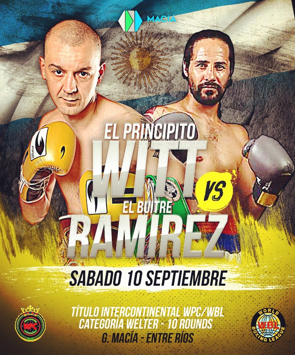 El boxeador local Juan Manuel “el Principito” Witt (36-1-2, 28Ko) combatirá el próximo sábado 10 de septiembre en la ciudad de Gobernador Maciá en la provincia de Entre Ríos. Será por la defensa de sus títulos Intercontinental WPC (World Pugilims Commission) y WBL (World Boxing League) de la categoría welter a la distancia de 10 rounds.