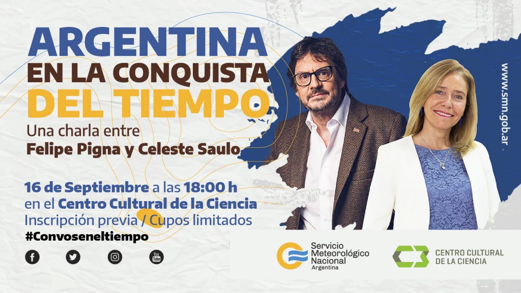 El historiador Felipe Pigna y Celeste Saulo, directora del Servicio Meteorológico Nacional (SMN) dialogarán acerca de la historia de la meteorología en nuestro país. Será el viernes 16 de septiembre, en el Centro Cultural de la Ciencia (Godo Cruz 2270). La entrada es libre y gratuita y solamente requiere inscripción previa haciendo clic acá. Los cupos son limitados.