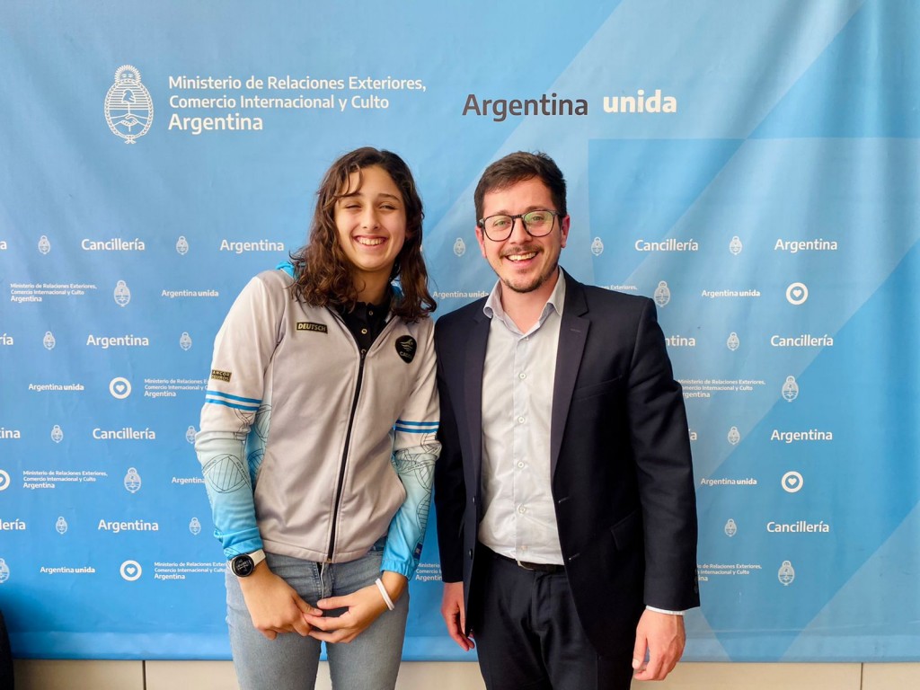 En ese marco, el Director del Ministerio de Relaciones Exteriores Alejo Sarna, recibió a la nadadora para transmitirle el apoyo y acompañamiento, siendo su próxima competencia en los Sudamericanos de Asunción, Paraguay.