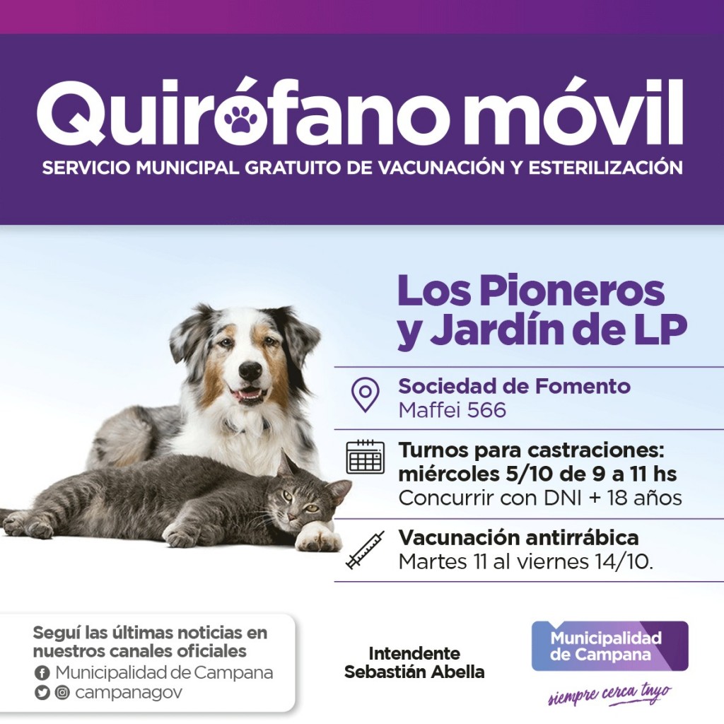 El Municipio, a través de la Dirección General de Políticas y Desarrollo Sostenible, informa que el quirófano móvil estará en los barrios Los Pioneros y Jardín de los Pioneros, realizando castraciones gratuitas a mascotas de los vecinos que residan allí.
