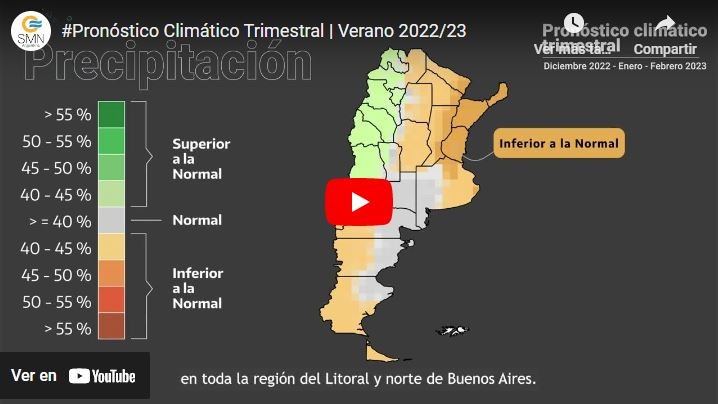 Para el trimestre diciembre-enero-febrero existe una alta probabilidad de registrar precipitaciones por debajo del promedio en el Litoral y el norte de Buenos Aires, mientras que pueden esperarse lluvias normales o inferiores a lo normal en el este de Salta, Santiago del Estero, Córdoba y el oeste y sur de Patagonia.