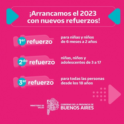 El Gobierno de la Provincia de Buenos Aires, a través del Ministerio de Salud, comienza a aplicar nuevos refuerzos de la vacuna contra el COVID-19. Serán el primer refuerzo para niños y niñas de 6 meses a 2 años, el segundo refuerzo para personas de 3 a 17 años y el tercer refuerzo para todos y todas las personas mayores de 18 años.