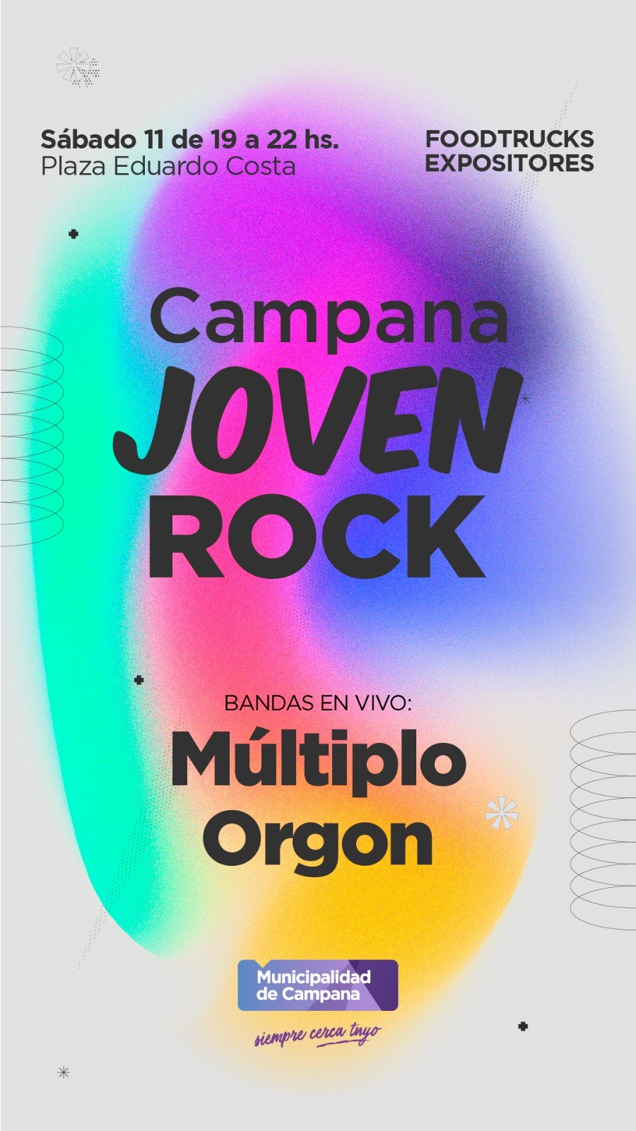 En un evento impulsado por Campana Joven, los vecinos podrán disfrutar de un show de las bandas locales Múltiplo y Orgon. También habrá food trucks y expositores.
