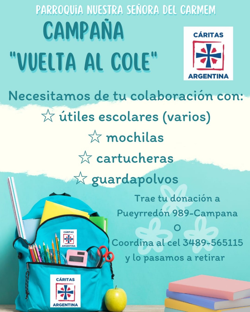 Una denominada "Vuelta al Cole" donde se solicitan útiles escolares que se puedan donar como así también ropa, toallas y sábanas. Las donaciones se pueden entregar en Pueyrredón 989 o llamando al celular 3489565115 y un representante de Cáritas pasará a retirar por el domicilio.