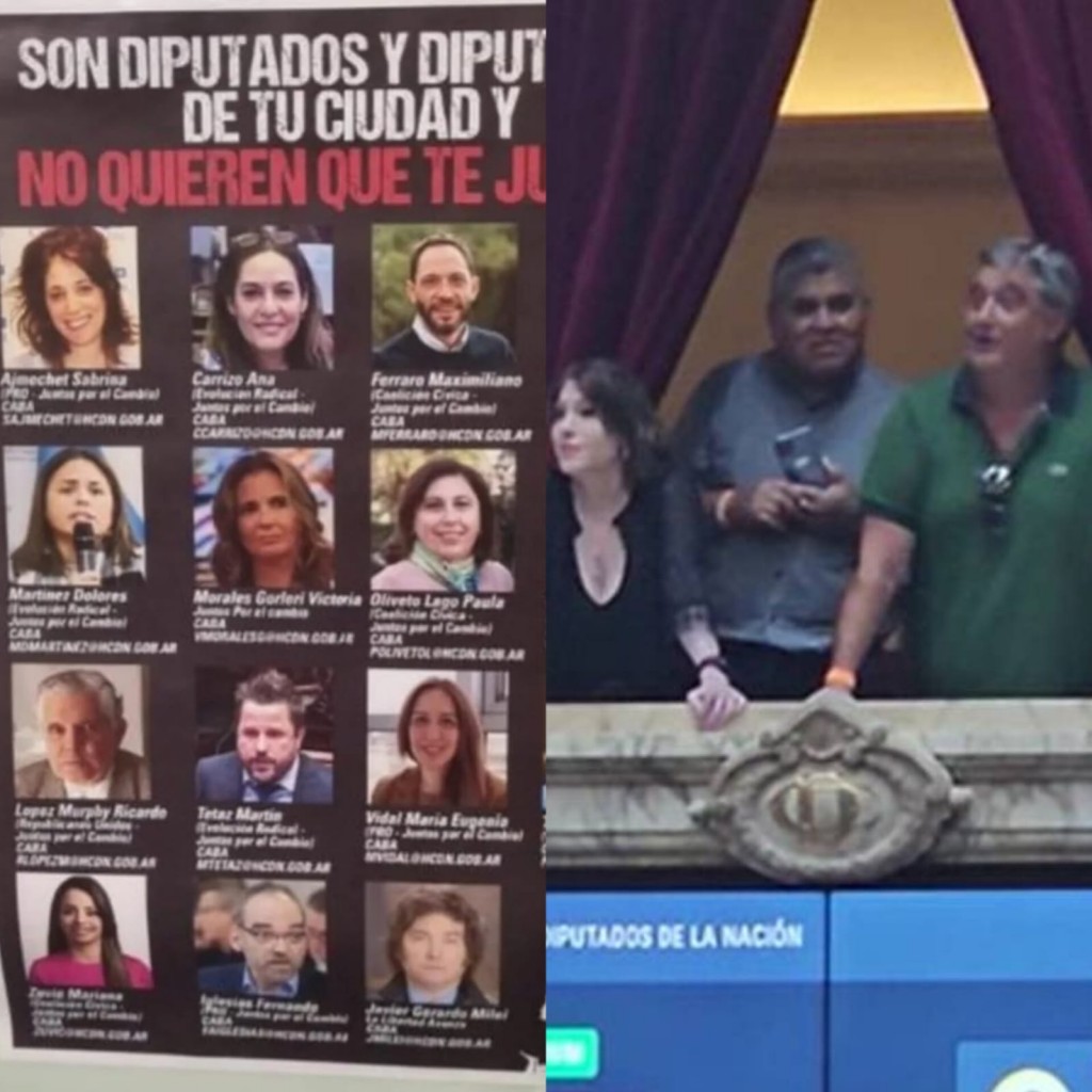 Los afiches tienen los rostros de los diputados opositores y abajo la inscripción: "Gracias a estos tipos más de un millón de ciudadanos no van a poder jubilarse. Legislan para un pueblo que odian". Bajo las fotos de las caras de 131 diputados de la oposición, el cartel enuncia: "Buscalos, seguramente hay algún vecino tuyo".