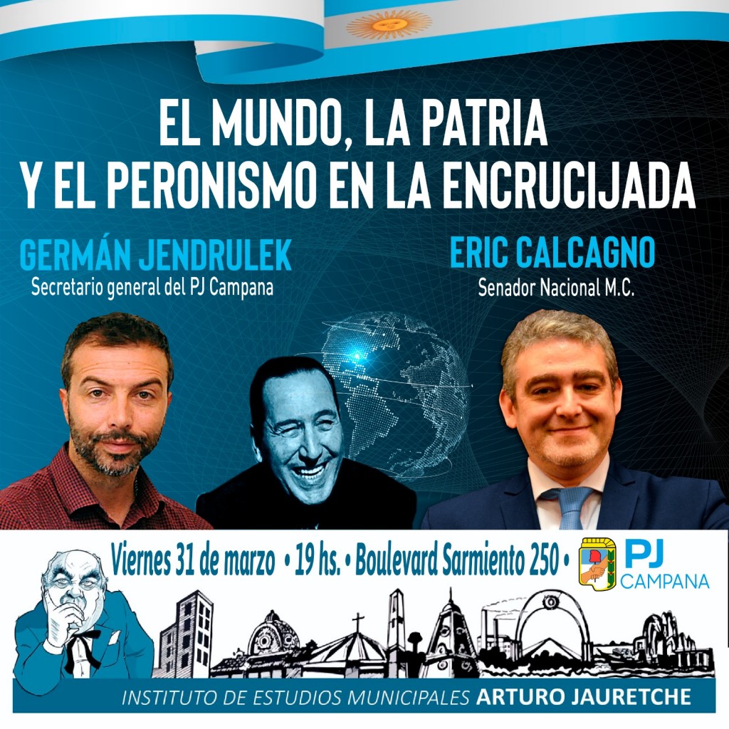 Será este viernes 31 de marzo desde las 19 horas en la Sede del P.J Campana Boulevard Sarmiento 250 organizada por el Instituto de Estudios Municipales Arturo Jauretche, la charla estará a cargo del Secretario General del P.J Germán Jendrulek que contará con la visita del Ex Senador Eric Calcagno el tema será: "El Mundo, la Patria y el Peronismo en la encrucijada" con entrada libre y gratuita.