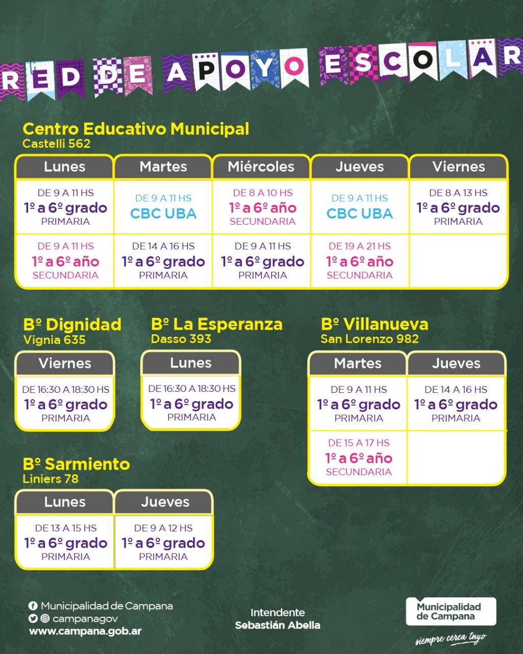 - Centro Educativo Municipal (Castelli 562): lunes de 9 a 11; miércoles de 8 a 10, y jueves de 19 a 21