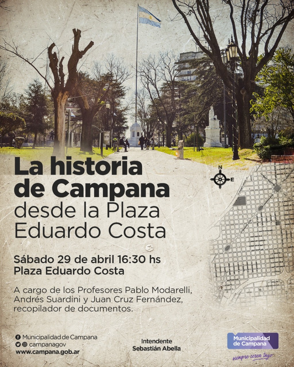La propuesta será este sábado a las 16.30 en la emblemática plaza central y estará a cargo de los profesores Andrés Suardini y Pablo Modarelli; y el recopilador de documentos, Juan Cruz Fernández, quienes realizarán un recorrido histórico por el principal espacio público de la ciudad.
