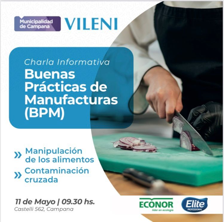 El próximo jueves 11 de mayo, desde las 9:30, en las instalaciones del Centro Educativo Municipal (Castelli 562), se llevará adelante una charla informativa sobre Buenas Prácticas de Manufacturas (BPM), con la organización conjunta entre la Dirección General de Calidad Ambiental, Bromatología y Zoonosis del Municipio y la empresa Vileni.
