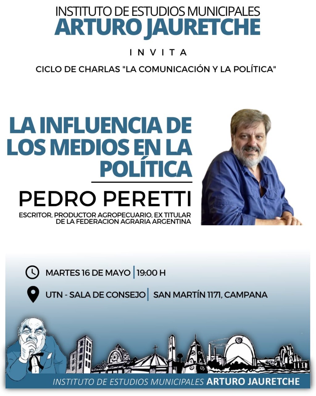 El Instituto de Estudios Municipales "Arturo Jauretche" prepara la visita de Pedro Peretti quién es escritor, productor agropecuario, ex titular de la Federación Agraria Argentina con una charla denominada : La influencia de los medios en la política.