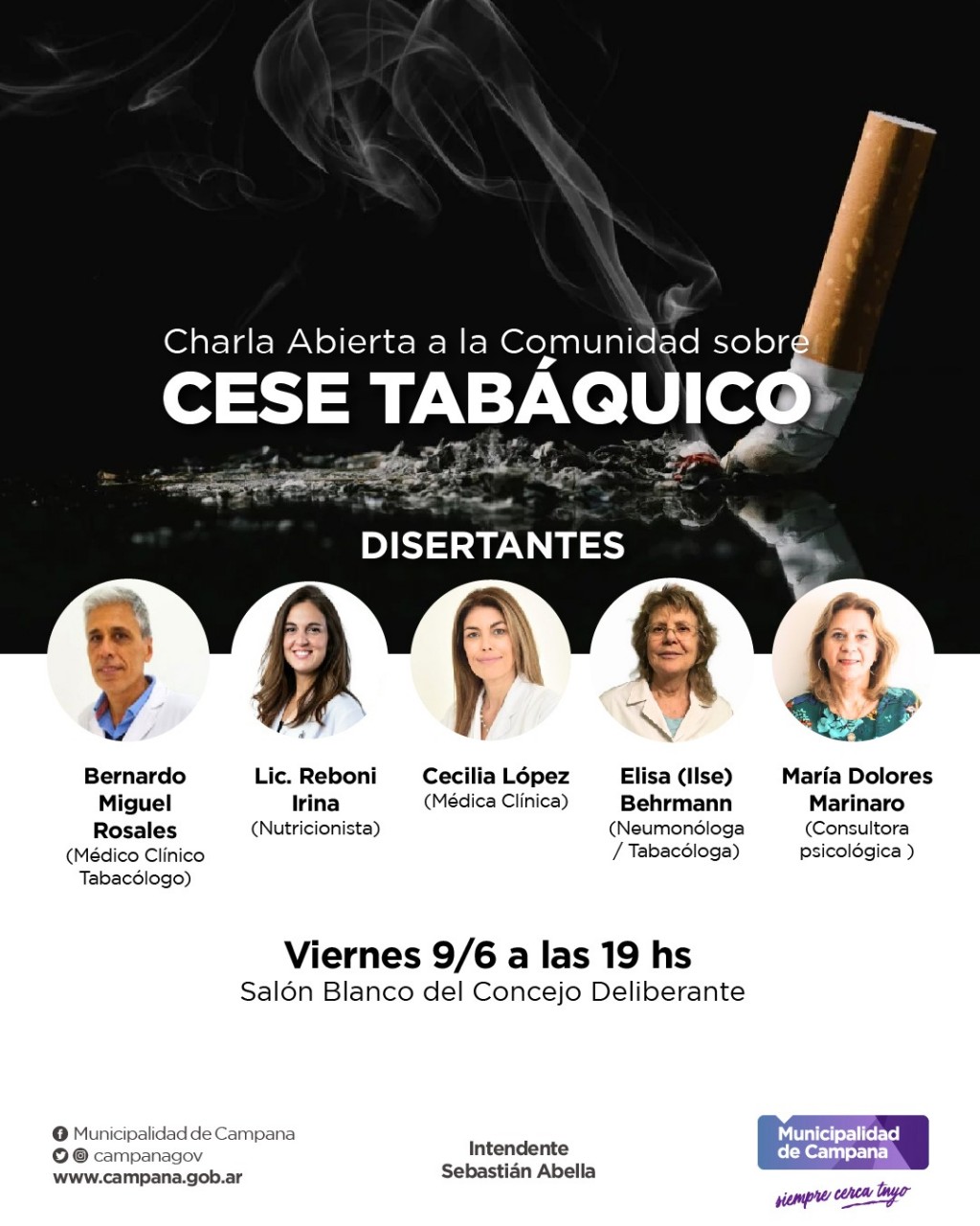 Quienes disertarán en esta charla abierta a la comunidad serán la médica clínica, Cecilia López; el médico clínico tabacólogo, Bernardo Miguel Rosales; la nutricionista Irina Reboni; la neumonóloga y tabacóloga, Elisa (Ilse) Behrmann y la psicóloga María Dolores Marinaro.
