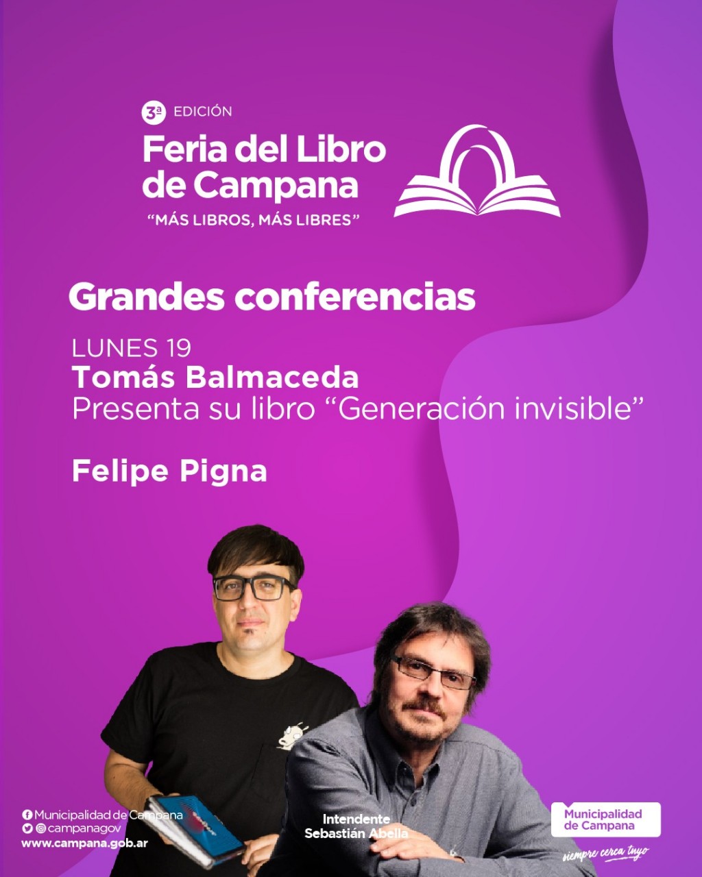 Su conferencia está pautada para el lunes 19 a las 17 en el escenario principal del evento que se desarrollará en el Club Ciudad de Campana, con entrada libre y gratuita y organización de la Secretaría de Inclusión, Educación y Cultura del Municipio.