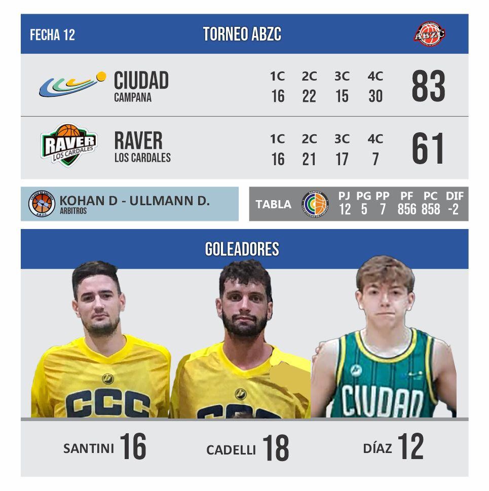 Logró cortar la racha de partidos perdidos al vencer a Ing. Raver de Los Cardales por 83 a 61 teniendo como máximos encestadores a Cadelli 18 y Santini con 16 puntos.