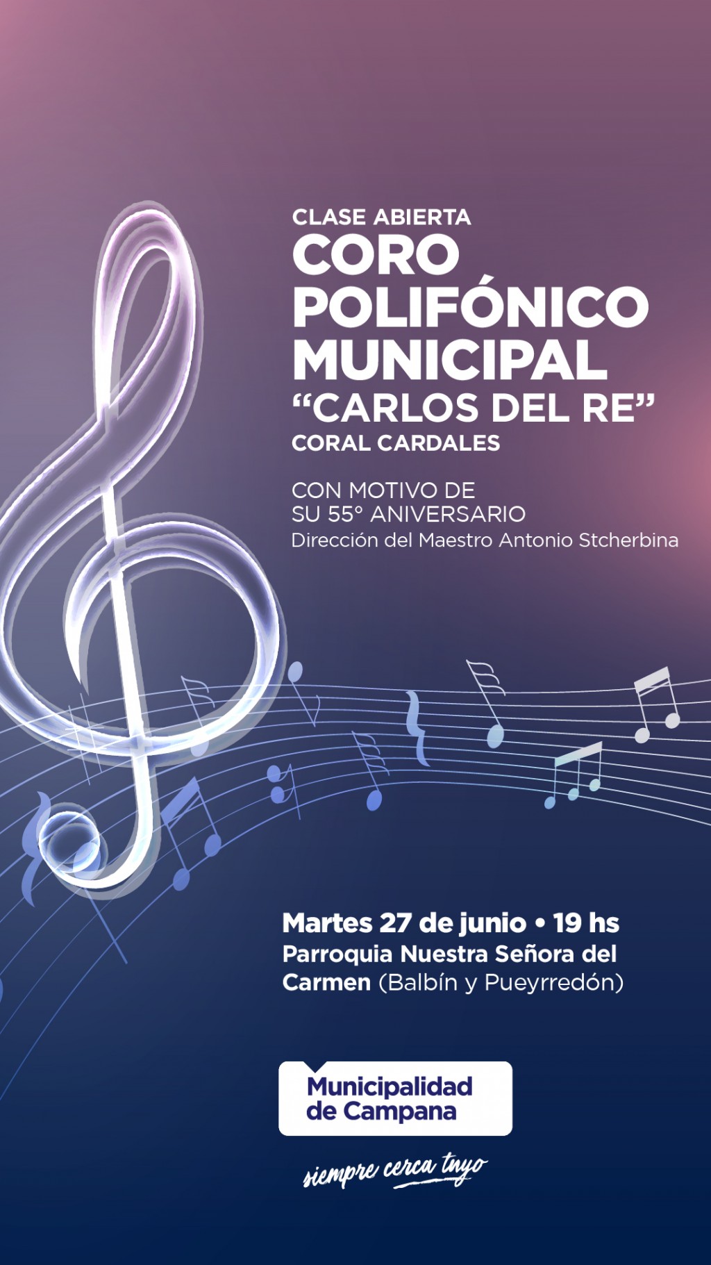 En el marco de su 55º aniversario, el Coro Polifónico Municipal brindará una clase abierta a la comunidad el próximo martes 27 de junio, a las 19, en la parroquia Nuestra Señora del Carmen (avenida Balbín y Pueyrredón).