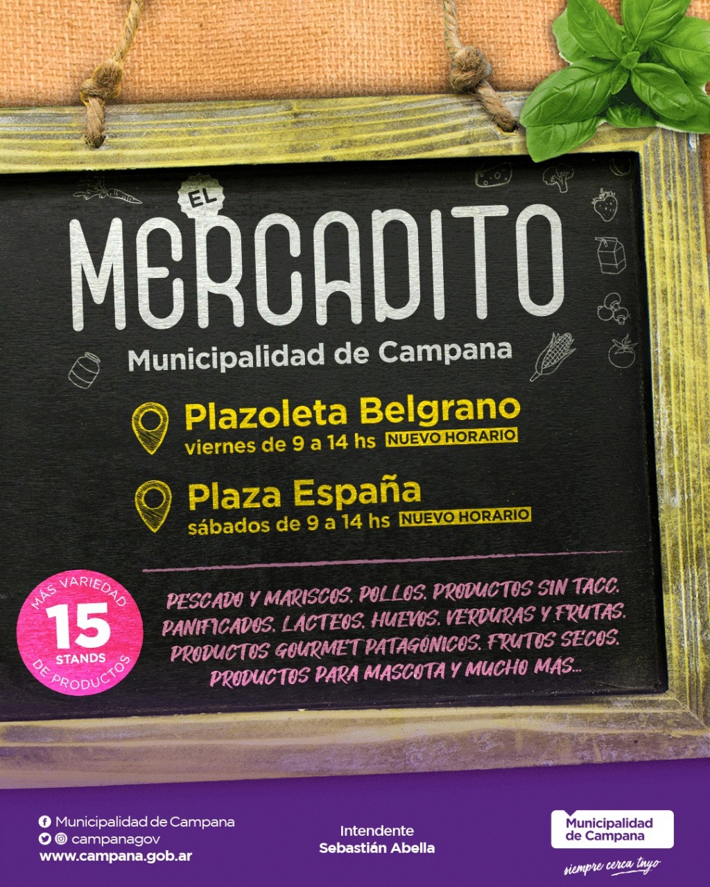 Ante la llegada de las bajas temperaturas, el Mercadito de Campana cambia de horario. Tanto los días viernes en la Plazoleta Belgrano como los días sábado en la Plaza España, el horario será de 9 a 14.