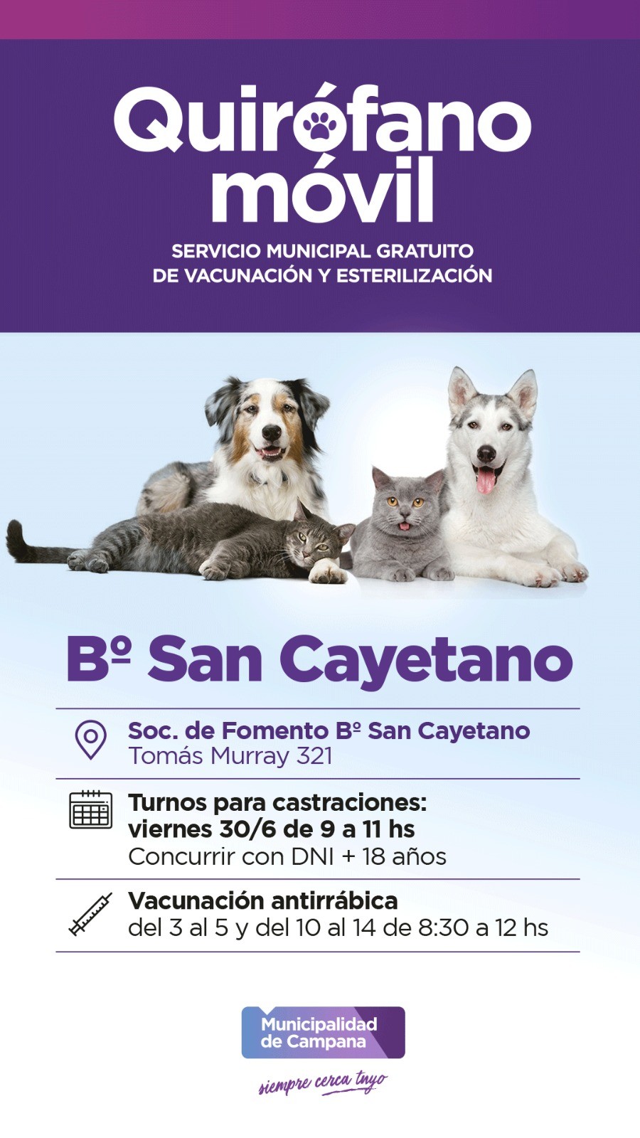 El operativo se extenderá los días 3, 4, 5 y 7 de julio y del 10 al 14 de julio. Los vecinos de los barrios mencionados que quieran llevar a sus mascotas deberán retirar un turno este viernes 30 de junio, de 9 a 11, en la sociedad de fomento de San Cayetano (Tomás Murray 321).