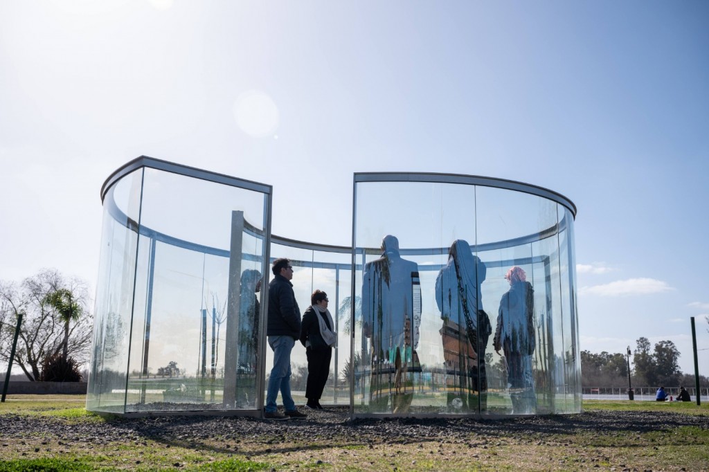 La charla se organizó frente a la obra Whirligig (Molinete), del artista conceptual Dan Graham, que fue instalada por Tenaris y Fundación PROA hace ocho meses en la Nueva Costanera de Campana. Lideraron la capacitación Melina Romero y Noemí Aira, integrantes del Departamento de Educación de Fundación PROA.