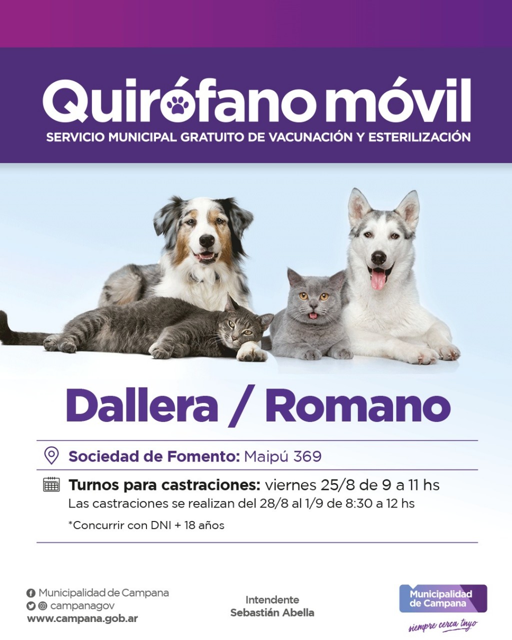 El operativo se extenderá del lunes 28 al 1 de septiembre. Los vecinos que quieran asistir con sus mascotas deberán solicitar un turno este viernes 25 de 9 a 11, en la sociedad de fomento ubicada en Maipú 369. Por un atraso de la producción del Gobierno nacional, no se aplicarán vacunas antirrábicas.