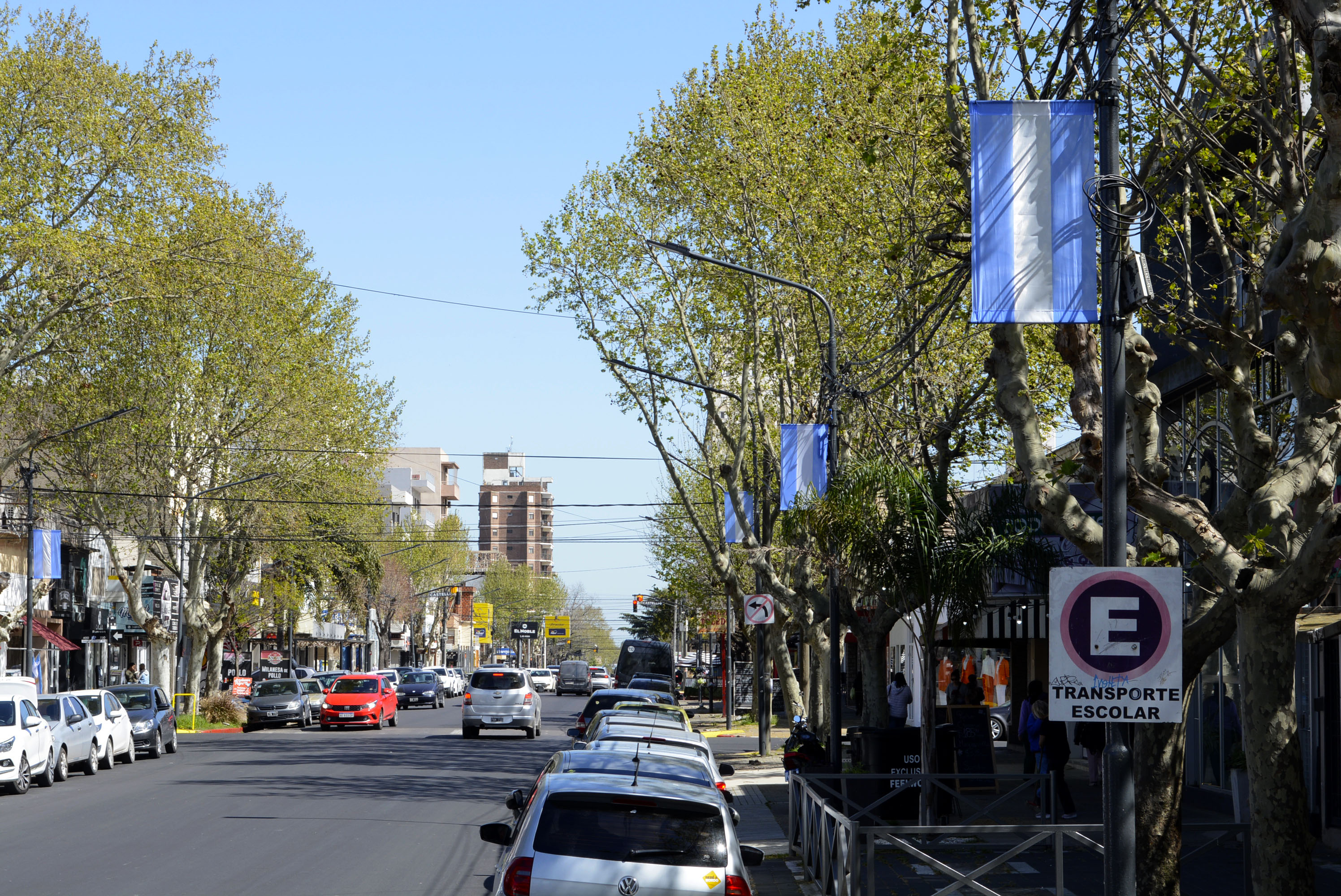 En la avenida Mitre, la colocación de banderas acompaña las obras de asfalto y pavimento de hormigón y la instalación de luminarias LED y nueva señalética. Próximamente, además, se realizará la demarcación vial.