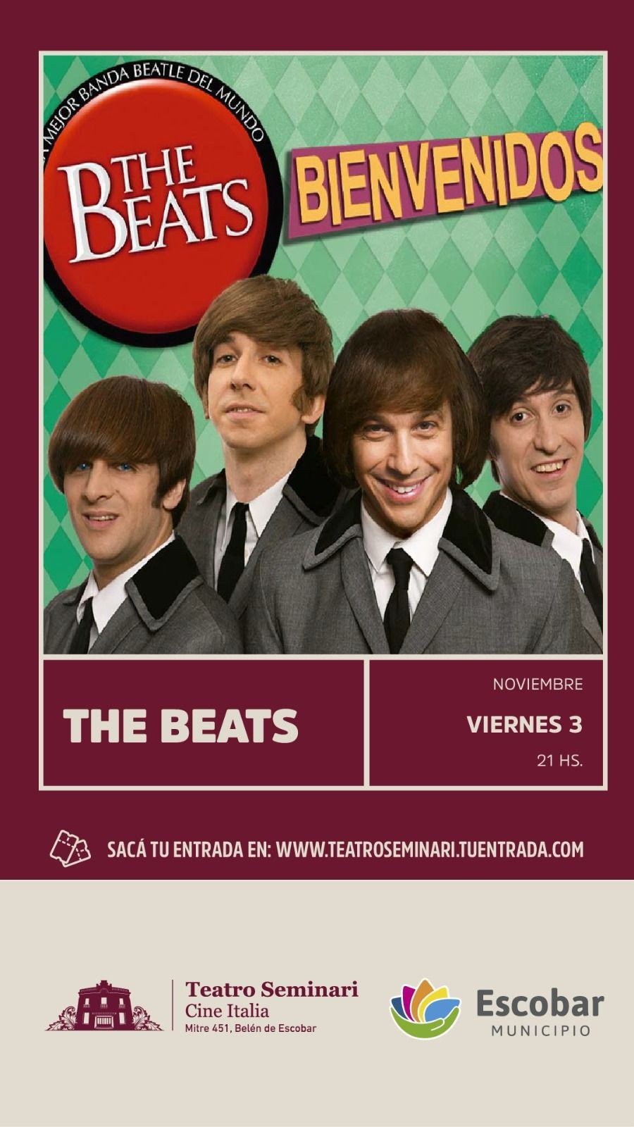 La banda, liderada por Patricio Pérez junto a su elenco, da vida en escena a George Harrison, John Lennon, Paul McCartney y Ringo Starr para el placer de todos los amantes del cuarteto de pop rock inglés. THE BEATS estrena “BIENVENIDOS” la obra teatral-musical que utiliza la única colección completa que existe a nivel mundial de los instrumentos y amplificadores originales que utilizaban los Cuatro Genios de Liverpool.