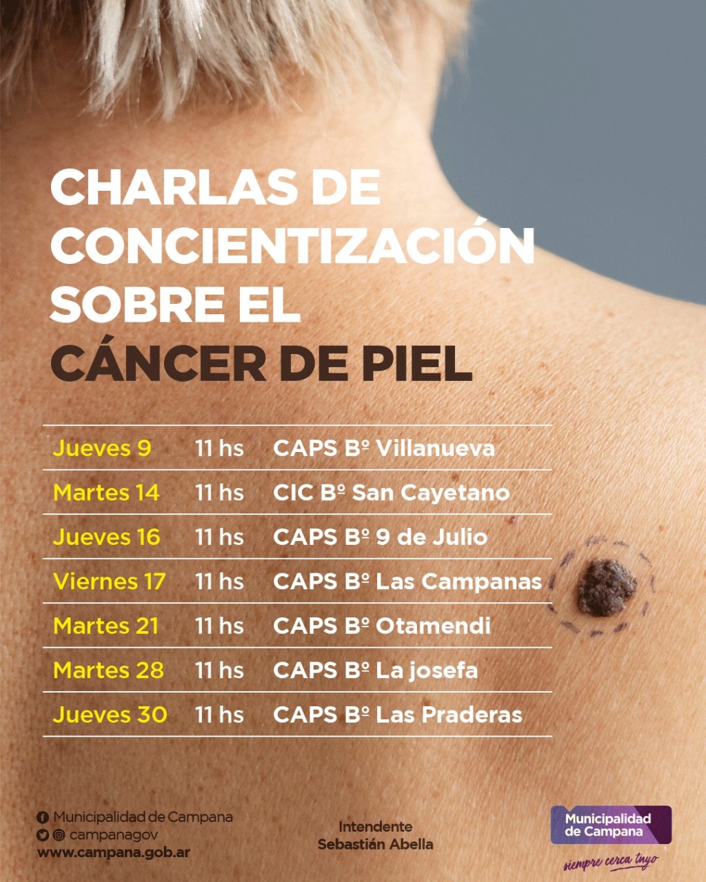 La Secretaría de Salud del Municipio adhiere a la Campaña Nacional de Prevención del Cáncer de Piel y, en el marco del mes de concientización, durante noviembre se brindarán una serie de charlas informativas gratuitas abiertas a la comunidad.