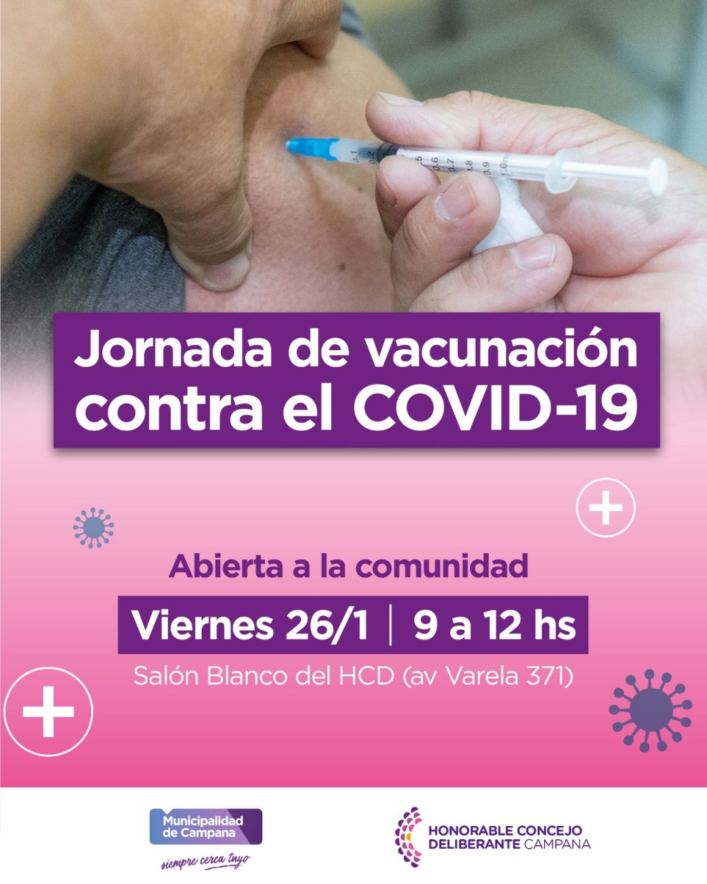 Este viernes de 9 a 12 se realizará una jornada de vacunación contra el Covid-19 en el Salón Blanco del Palacio Municipal (Varela 371), impulsada por la Secretaría de Salud del Municipio junto al Honorable Concejo Deliberante (HCD).